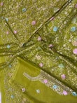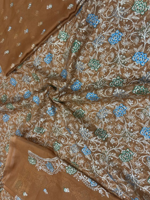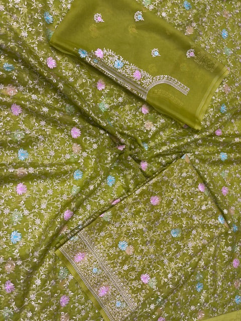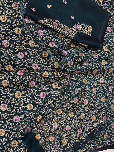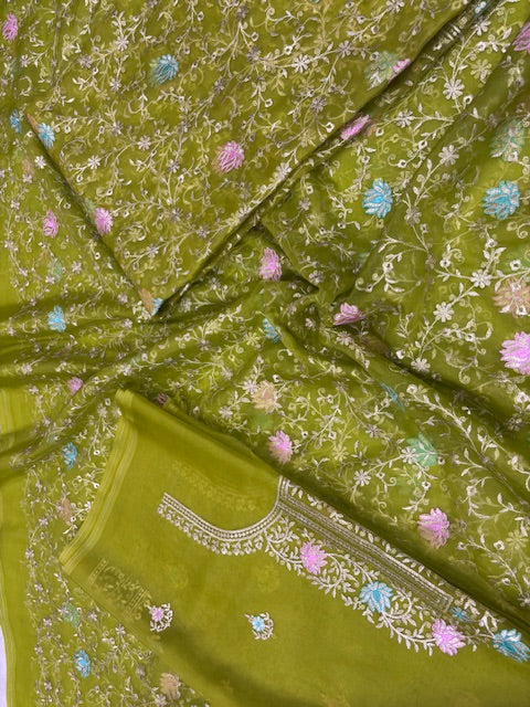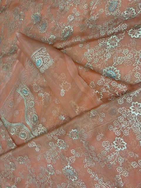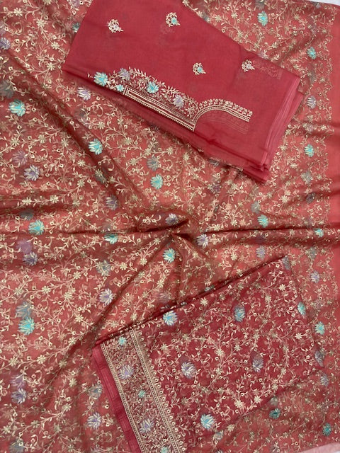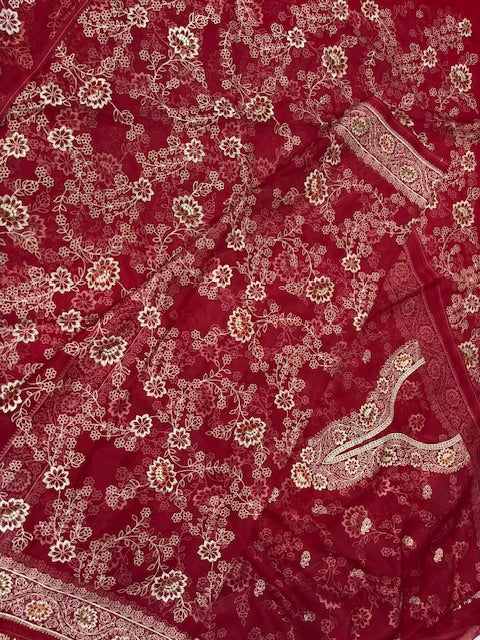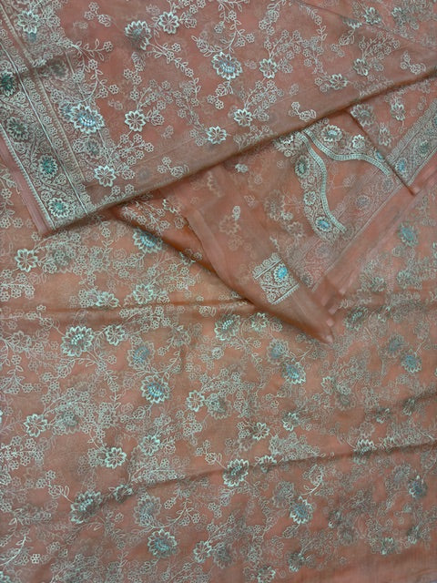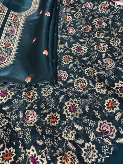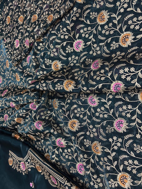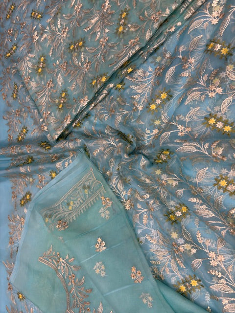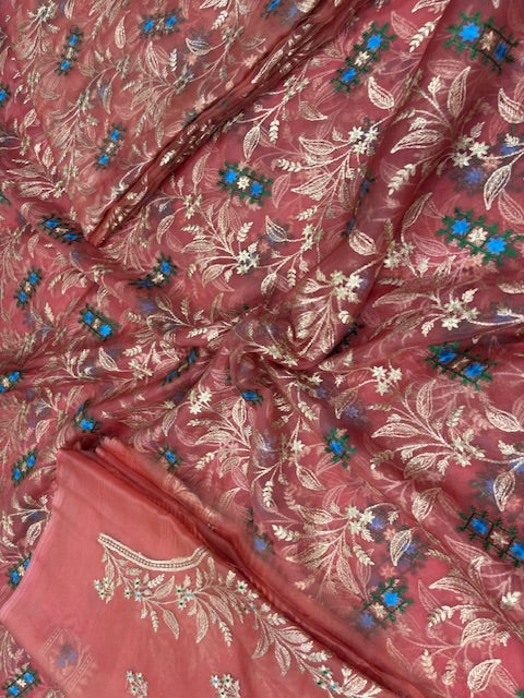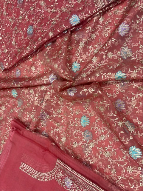 organza embroidery garara with beautiful meenakari with koti and beautiful embroidery dupatta , garara length of 5+meter , dupatta length 2+ ,koti length 2+ .